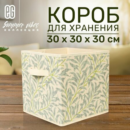 Открытый короб для хранения одежды Размер: 30х30х30 см Материал: нетканый 70 г/см, картонные вставки Дизайн: цвет-бежево-зеленый, принт-листья