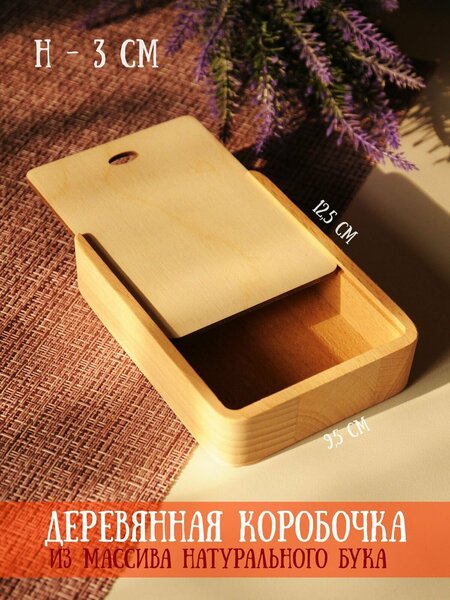 Деревянная коробка для подарков и украшений с выдвижной крышкой. Внешний размер: 12.5 х 9.5 х 3 см. Внутренний размер: 11.5 х 8.5 х 2.5 см. Подходит для упаковки подарков и сувениров по любому поводу. Отлично подойдёт для упаковки колец, сережек, брелков, украшений, мелких вещиц и др. В дальнейшем можно использовать как коробочку для хранения. Натуральное дерево: коробочка сделана из массива бука, крышка изготовлена из березовой фанеры толщиной 3 мм. Детали изделия бережно отшлифованы вручную и не имеют покрытия лаком.