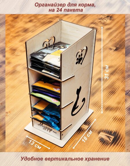 Контейнер для хранения влажного корма - совершенно необходимая вещь для каждого владельца животнх. Очень легко ликвидировать беспорядок, всего лишь поставив на полку - у вас сразу появится удобный органайзер для паучей с разделителями. Обычно мы храним корм для кошек и собак в простых коробках и поиск чего-то определенного занимает время, не всегда видно - сколько еще пакетиков осталось. Ящик сделан с учетом стандартных размеров кухонных модулей - он идеально встанет на полку, позволяя максимально эргономично использовать пространство. Коробка для хранения с разделителями позволит легко выбрать любимый корм. Все разделители вынимаются, можно легко изменить количество отделений под ваши запросы. Органайзер для кошачьего и собачьего корма может использоваться так же для хранения, например, семян. Внимание! Ящики доставляются в разобранном виде, сборка занимает пару минут и не требует специальных инструментов. Пожалуйста, при сборке обязательно следуйте инструкции - соединяйте детали в правильном порядке. После распаковки может чувствоваться запах дерева, через несколько дней запах полностью пропадет.