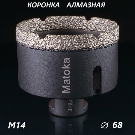 Коронка серия Matoka для УШМ М14, С ТЕХНИЧЕСКИМ ВОСКОМ 68*35 mm Назначение: керамогранит, гранит Особенности: алмазные коронки с резьбовым соединением М14 для сухого и мокрого высверливания отверстий в искусственном и натуральном камне с помощью УШМ. Коронки оснащены техническим воском, который способствует увеличению срока службы. Технология производства: вакуумная пайка Коронка алмазная по керамограниту 68 мм для УШМ (сухое сверление) Matoka – это высококачественный инструмент, предназначенный для сверления отверстий в искусственном и натуральном камне. Особенностью данной коронки является алмазное покрытие режущей части, что обеспечивает высокую точность и чистоту сверления. Коронка оснащена хвостовиком M14, что позволяет использовать ее с большинством УШМ. Диаметр коронки составляет 68 мм, что делает ее подходящей для выполнения различных задач. В комплекте с коронкой идет технический воск, который способствует увеличению срока службы инструмента. Выбирая алмазную коронку по керамограниту 68 мм для УШМ Matoka, вы получаете надежный и качественный инструмент для выполнения различных работ по сверлению отверстий в искусственном и натуральном камне.