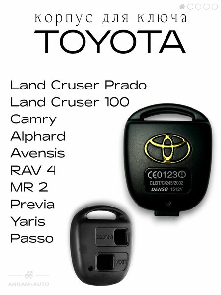 Предлагаем вашему вниманию корпус для ключа зажигания, идеально подходящий для автомобилей Тойота. Этот надежный и качественный корпус ключа станет отличным решением для замены изношенного или поврежденного элемента. Изготовленный с использованием современных технологий, он совместим с различными моделями Toyota, что позволяет вам легко восстановить функциональность вашего ключа. Корпус ключа Тойота обеспечивает высокий уровень защиты внутренностей от внешних факторов, таких как пыль и влага. Он не только сохранит работоспособность вашего ключа, но и придаст ему стильный внешний вид. Легкий и компактный, корпус удобно лежит в руке и не занимает много места в кармане или сумке. Заменив корпус ключа зажигания, вы можете быть уверены в его надежности и удобстве в использовании. Данный продукт предназначен для владельцев автомобилей Тойота, которые ценят качество и долговечность. Не откладывайте на завтра то, что можно сделать сегодня - обновите свой ключ уже сейчас! Корпус подходит для следующих моделей: Toyota. Он позволит вам не только восстановить внешний вид ключа, но и значительно продлить его срок службы. С ним ваш ключ будет выглядеть как новый! Если вы ищете надежный и качественный корпус ключа зажигания для вашей Toyota, то этот продукт станет отличным выбором. Убедитесь, что ваш автомобиль защищен, а ключ выглядит привлекательно. Не упустите возможность обновить ваш ключ зажигания – это небольшое вложение, которое может сделать использование вашего автомобиля гораздо более приятным. Перед покупкой проверьте, соответствует ли Ваш автомобильный ключ предлагаемому корпусу.