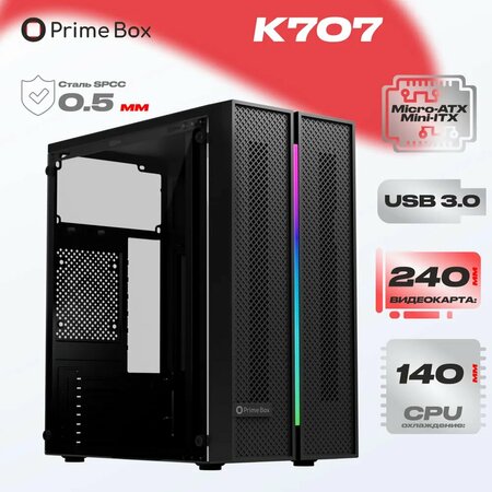 Компьютерный корпус Prime Box K707 - это стильный и функциональный выбор для вашего ПК. Корпус выполнен из стали, что обеспечивает его прочность и долговечность. Черный цвет корпуса придает ему элегантный и современный вид. Prime Box K707 поддерживает форм-факторы материнской платы Micro-ATX и Mini-ITX, что позволяет использовать различные конфигурации системы. Максимальная высота процессорного кулера составляет 140 мм, а максимальная длина видеокарты - 240 мм (c установленными спереди вентиляторами до 215 мм). На лицевой панели корпуса расположены три интерфейса USB один USB 2.0 и два USB 3.0, а также вход для микрофона и выход на наушники. Это обеспечивает удобное подключение различных устройств и аксессуаров. В корпусе предусмотрено четыре слота расширения, два внутренних отсека 2,5" и один отсек 3,5". Это позволяет установить достаточное количество накопителей и других компонентов. Окно из акрила на боковой стенке корпуса позволяет наблюдать за работой системы, что добавляет эстетическую привлекательность. Корпус поддерживает установку одного вентилятора 80x80 мм и одного вентилятора 120x120 мм. Это обеспечивает эффективное охлаждение компонентов системы и поддержание оптимальной температуры. Компьютерный корпус Prime Box K707 - это сочетание стиля, функциональности и качества. Он станет отличным выбором для тех, кто ценит надежность и эстетику в своем ПК.