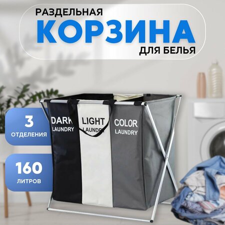 Корзина для белья, 3 отделения, в ванную для сортировки и хранения белья с разделителем 110 л.