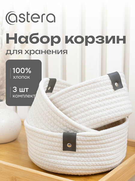 Набор из трех плетеных корзинок диаметром 15,19,20 см и высотой 9 см для хранения вещей и поддержания порядка в вашем доме. Функциональные и стильные органайзеры из натурального эко хлопка украсят интерьер ванной, спальни или прихожей. Благодаря использованию гипоаллергенных материалов, изделие безопасно и долговечно. Даже при интенсивном пользовании корзины сохраняют свои первоначальные свойства. Изделия очищаются от пыли с помощью щетки или пылесоса. Декоративный аксессуар можно использовать для полотенец, косметики, ключей и других мелочей. Допустимо отклонение в размерах полотна в пределах 2 см.