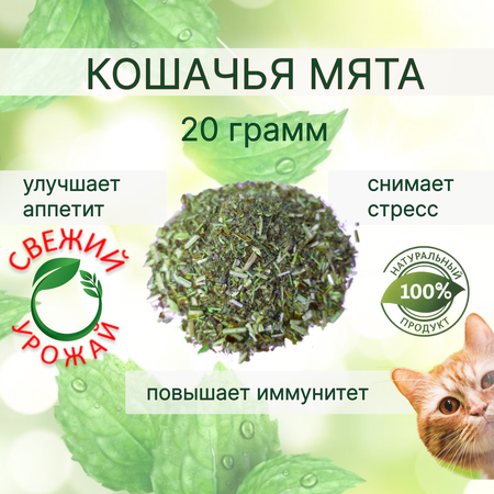 Кошачья мята (котовник, nepeta) – это ароматное растение с высоким содержанием эфирных масел, запах которого очень необычно влияет на кошек. Некоторые кошки очень активно реагируют на запах, начиная проявлять любовь и нежность к источнику запаха. Растение оказывает положительное воздействие на настроение и поведение кошки. При вдыхании запаха котовника питомец возбуждается, становится активным и проявляет особый интерес к источнику аромата, а при поедании растение оказывает седативный успокаивающий эффект. Наш котовник выращен в России в экологически чистом районе Краснодарского края и имеет мелкий помол. Кошачья мята поможет в корректировке поведения и закрепления полезных привычек питомцев. Действие котовника, как правило, непродолжительное: через 5-15 минут питомец приходит в норму, организм адаптируется к запаху и перестает его воспринимать. Чтобы кошка снова заинтересовалась растением, должно пройти несколько часов. Кошачья мята не вызывает привыкания, поэтому животное не будет искать растение по дому. Кошачья мята, несмотря на схожий эффект с валерьяной, не представляет опасности здоровью питомца. После контакта с растением у кошки не наблюдается похмелье, депрессия и не происходит привыкания. Перед применением чтобы извлечь эфирное масло, потрите мяту руками, перед тем как насыпать на пол или хорошенько разотрите на нужной поверхности. Кошки и коты могут не реагировать в случае сильного стресса. Поэтому лучше побаловать своего питомца до стрессовой ситуации (например, поездкой на машине или походам к ветеринару), чтобы он успел расслабиться. Причины отсутствия реакции: - 30 % кошек не имеют рецепторов, позволяющих почувствовать запах мяты - мята может не оказывать влияния на котят не достигших половой зрелости - питомцы после стерилизации могут потерять интерес к мяте - в пожилом возрасте обонятельная система питомца хуже воспринимает запахи Не рекомендуется использовать: - при беременности - при гипервозбудимости - при слабом желудке - при различных расстройствах нервной системы