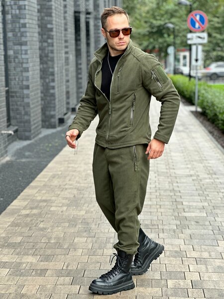 Мужской флисовый трикотажный костюм зеленого цвета на осенний сезон состоит из двух предметов: широкие штаны на резинке и удобная удлиненная кофта на замке с воротником-стойкой и липучками на рукавах. Тактический спортивный комплект с штанами предназначен для мужчин. Военный или боевой костюм свободный и комфортный. Теплый трикотажный камуфляжный комплект на молнии изготовлен из качественных материалов. Туристическая одежда из флиса идеально подходит на лето, осень, весну и зиму. Рыбацкие штаны и кофта имеют большие размеры. Данная модель подходит для игры в страйкбол. Тактическая одежда с карманами отлично подойдет для активного отдыха, в походе, туризме, в лес, удобен для охоты и рыбалки. Мужская спецодежда имеет большое количество закрывающихся карманов, в том числе и на рукавах.