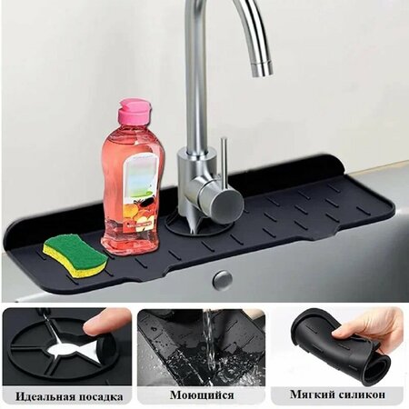 Силиконовый коврик для раковины – отличный функциональный аксессуар для вашей кухни, который будет решать сразу несколько важных задач. В первую очередь он выступает в качестве надежной защиты элементов смесителя и самой раковины от ржавчины и образования в этой области известкового налёта и плесени. Сам коврик служит непосредственно для размещения на нём губки для мытья посуды, ёмкости с моющим средством и дополнительных аксессуаров, которые должны находиться постоянно рядом с раковиной. Такой коврик избавит вас от необходимости всякий раз протирать раковину от капель воды и стол в тех местах, где лежат губка и металлическая щётка. Представленный силиконовый коврик в раковину на кухню является функциональной альтернативой всякого рода тряпкам и подстилкам из микрофибры, которые выполняли функцию впитывания влаги ранее, а теперь остались лишь в прошлом. Такой импровизированный органайзер на мойку освободит вам лишнее время и позволит раковине и смесителю дольше оставаться в презентабельном виде. Силиконовая накладка для крана прямоугольной формы с круглым вырезом по центру под смеситель. Силиконовый коврик полностью безопасен и экологичен. Ещё его можно использовать в качестве сушилки для столовых приборов, небольших чашек и так далее. Минималистичный дизайн позволит применить его в любой кухне вне зависимости от стиля и цветовых решений. Такой коврик выступает своеобразным барьером для влаги между мойкой, раковиной, смесителем. Он универсален и подойдёт для любых поверхностей. Характеристики: Материал: силикон; Цвет: серый, черный и белый; Размеры: 370х140х8 мм; Максимальный диаметр под кран: 6,3 см; Вес: 110 гр.