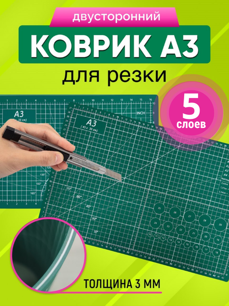 Коврик для резки а3 AXLER защитит ваш рабочий стол от повреждений, сделает его идеальным местом для творчества! Он подойдет для раскройки ткани и кожи, работы с бумагой и картоном, пригодится для вырезания, лепки и рисования. Это незаменимый помощник для людей, увлекающихся квиллингом и скрапбукингом, пэчворком и шитьем, аппликацией, макетированием и моделированием. Коврик для творчества станет вашим верным спутником в мире рукоделия, где важна любая мельчайшая деталь. Мат для резки а3 удобного размера – 450х300 мм, а его толщина – 3 мм. Он достаточно плотный, не сминается при работе. Настольный коврик ПВХ состоит из 5 слоев и не дает затупиться инструментам или прорезать его насквозь. С ним можно использовать скальпели, роликовые раскроечные и канцелярские ножи. Покрытие мата самовосстанавливающееся – на нем затягиваются порезы. На большом ковре для раскроя есть разметка в сантиметрах и градусная сетка. С их помощью вы сможете точно отмерить и вырезать материалы под нужным углом, воплотить в жизнь все самые смелые идеи. В особенности это пригодится для кроя ткани, создания вытынанок, а также для макетных и лоскутных изделий, где точные измерения играют важную роль. Непрорезаемый двусторонний ковер обладает матовой поверхностью и не бликует от освещения, позволяя сосредоточиться. Даже при долгой работе глаза не устанут и вы сможете выполнить свои самые сложные задумки. Это удобная антискользящая подложка, по ней не будут скользить при кройке ткани и другие материалы. С поверхности легко удаляются загрязнения, это облегчает работу с пластилином и глиной. Погрузитесь в мир творчества с этим невероятным ковриком и дайте волю своему воображению. Ваши поделки станут еще более креативными, а работа будет приносить только удовольствие и радость! Купите раскройный коврик для рукоделия, расширьте новые горизонты для ваших изделий с товаром от Акслер!