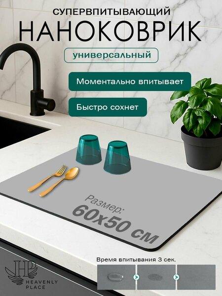 Коврик для сушки посуды диатомитовый 60х50х0,31 см, нано коврик для кухни, влаговпитывающий, быстросохнущий