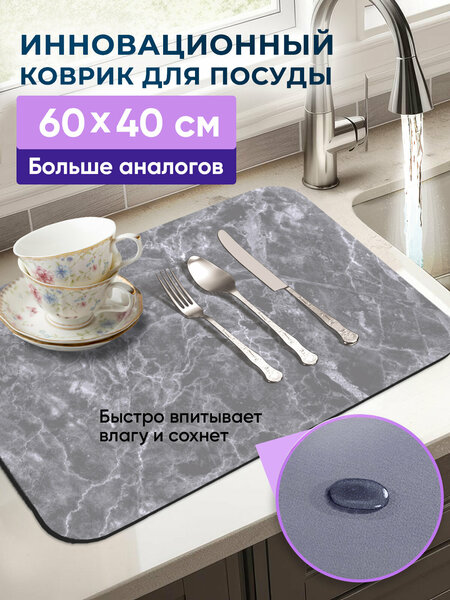 Впитывающий диатомитовый коврик для посуды — удобное современное приспособление для дома, которое не только существенно облегчает поддержание чистоты и порядка на кухне, но и может стать эстетичным элементом декора. Влаговпитывающий каучуковый ковер имеет прямоугольную форму и большой размер 60х40, что делает его удобным для использования на обеденном столе, раковине или столешнице. Быстросохнущий наноковрик с гидрофобным покрытием предназначен, в первую очередь, для сушки мокрой посуды после мытья. На нем можно удобно расположить значительное количество инвентаря: тарелки и блюдца; чашки, кружки и стаканы; вилки, ложки и другие столовые приборы. Помимо использования в качестве сушилки, супервпитывающая нано принадлежность потребуется для разморозки продуктов, в том числе, мяса, фруктов и овощей, и станет универсальной защитной подставкой под кофемашину, микроволновку и другую бытовую технику. Настольная подложка на резиновой основе отлично подходит для различных видов детского творчества: расположив ее на маленьком столике, можно надежно защитить поверхность от попадания влаги и пятен. Нескользящая подстилка пригодится на барной стойке или в шкафу для хранения различной утвари после мойки. Антискользящий нижний слой предотвращает скопление воды на кухонных поверхностях, а мягкий верхний слой приятен на ощупь. Прорезиненный чудо товар изготовлен из диатомита — прочного материала, устойчивого к механическим повреждениям и препятствующего размножению бактерий и грибков. Супер коврик прост в эксплуатации и уходе, легко очищается влажной тряпкой и надолго сохраняет первоначальный внешний вид.