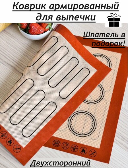 Профессиональный двухсторонний коврик изготовлен из силикона и армирован стеклотканью, благодаря чему тепло равномерно распределяется по всей площади. В подарок идёт кондитерский пластиковый шпатель, который предназначен для нарезки теста, выравнивания тортов, разделения продуктов на отдельные части. Армированный коврик имеет повышенную плотность и гладкую поверхность, идеально подходящую для раскатки теста. Коврик из качественного силикона также предназначен для выпечки кондитерских изделий, запекания рыбы, курицы, мяса и овощей. На силиконовом коврике легко готовятся кексы и эклеры, имбирные пряники, печенье, профитроли и другие десерты. Стойкий к температурным перепадам и может использоваться в качестве выпекания и заморозки, подставки под горячую посуду, прихватки. Работает при температуре от -40 до +230. Этот многоразовый силиконовый коврик полностью безопасен для пищевых продуктов, легко моется, не требует использования жира и масла, и не впитывает запахи. Он плотно прилегает к поверхности и не скользит, так что блюда не пригорают и легко снимаются.