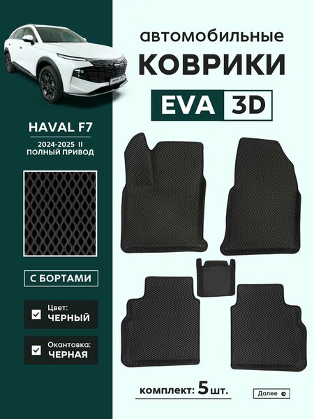 Коврики для машины Haval F7 2 4WD разработаны индивидуально, путем 3D сканирования салона и соответствует конкретной марки и модели автомобиля (в отличии от универсальных автомобильных ковриков). Качественные эва коврики способны защитить пол автомобиля, при этом они не стирают подошву обуви, устойчивы к химическим реагентам, не пропускают жидкость и не боятся моющих средств. Автомобильные коврики включают в себя: водительский, пассажирский, задние ряды и перемычку. Коврики в машину EVA автомобильные имеют глубину ячеек 6мм, плотность 55 шор, материал эластичный и в тоже время прочный и долговечный. Удобная 3D площадка для отдыха левой ноги водителя, кант из полипропиленовой стропы (который не расползается со временем), экологичный материал, полностью гипоаллергенный. 3д коврики в машину точно повторяют форму пола авто, обеспечивая надежную фиксацию и предотвращая скольжение по салону. Для дополнительного сцепления с поверхностью мы не только обеспечили коврики автомобильные штатными креплениями, но и добавили липучки на обратную сторону для еще более надежной фиксации. Коврики в машину на пол имеют высокие бортики. Высота борта 3-5 см надежно удерживает грязь, воду, песок, пыль и мелкий мусор, не давая им распространяться по салону. Коврики в машину EVA автомобильные для 3д имеют ячеистую структуру (в виде ромба) предотвращают проникновение влаги и грязи, делая коврики ева идеальными для использования зимой и осенью, в период снега и дождя, не боятся механических повреждений и перепада температур. Коврики ева с бортиками прекрасно подойдут в качестве подарка автовладельцу.