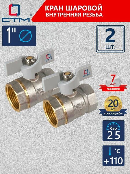 Кран шаровый для воды 1" набор 2 шт. Стандарт с внутренней резьбой, ручкой-бабочкой применяется в качестве запорной арматуры на трубопроводах систем питьевого, хозяйственно-бытового и промышленного назначения, систем холодного, горячего водоснабжения и отопления, сжатого воздуха и жидких углеводородах, а также трубопроводах, транспортирующих среды, не агрессивные к материалам крана. Особенности конструкции, технологии изготовления, применяемых материалов обеспечивают долголетнюю работу шарового крана СТМ стандарт при эксплуатации в условиях отечественных инженерных систем. Шаровой кран СТМ стандарт является неполнопроходным и ремонтопригодным. Корпус и шток крана изготовлены из высококачественной горячепрессованной латуни с никелированным покрытием. Шаровой затвор изготовлен из высококачественной горячепрессованной латуни, отполирован и покрыт хромом. Герметичность затвора крана соответствует наиболее высокому классу по госту 9544-2005 – А. Наличие тефлоновых седельных колец и сальниковой прокладки позволяет использовать шаровой кран СТМ стандарт в отопительных системах с рабочей температурой до 110 С. Оптимальная длина резьбы обеспечивает надёжное соединение. Техническое обслуживание крана в течение всего срока эксплуатации не требуется (средний срок службы – 20 лет, средний ресурс наработки на отказ – 35000 циклов). Нормативное давление - 25 бар.
