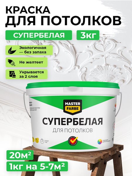 Краска акриловая MASTERFARBE супер белая быстросохнущая и водоэмульсионная предназначена для потолков в сухих помещениях. Она обеспечивает гладкое и глубокоматовое покрытие, которое отлично подходит для различных поверхностей, таких как гипсокартон, бетон, кирпич, древесина, обои, металлические и другие поверхности. Краска MASTERFARBE супер белая отличается экологичным составом без запаха, который разбавляется водой. Это делает ее безопасной для использования в детских и лечебных учреждениях, а также пожаробезопасной. Краска не желтеет со временем, сохраняя свежий белый цвет потолка на длительный период. Краска легко наносится и укрывает за 2 слоя. Расход составляет 1 кг на 5-7 м² в зависимости от структуры и впитывающих свойств поверхности. Основание для нанесения краски должно быть чистым и прочным, меловую побелку следует смыть. Поверхность обрабатывается грунтовкой перед применением краски. Температура поверхности во время работ должна быть не ниже +5°С. Второй слой наносится не ранее, чем через 8 часов после первого. После окончания работ инструмент и емкости промываются теплой водой с мылом. Краска MASTERFARBE супер белая сертифицирована для детских и лечебных учреждений, а также для наружных и внутренних работ. Она подходит для использования на потолках из бетона, гипсокартона, ДСП, ДВП в жилых и других сухих помещениях. Объем краски составляет 3 кг, что обеспечивает достаточное количество материала для покрытия больших площадей.