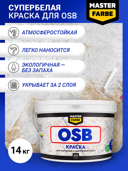Masterfarbe Супербелая акриловая краска для OSB плит. Для наружных и внутренних работ, 14 кг Супербелая. Атмосферостойкая. Экологичная — без запаха, разбавляется водой. Колеруется красителями для ВД красок и в колеровочных системах. Легко наносится. Укрывает за 2 слоя. Пожаробезопасна. Назначение Предназначена для декоративно-защитного окрашивания OSB-плит, SIP панелей и других поверхностей внутри и снаружи помещений. Создает матовое, паропроницаемое, влагостойкое покрытие, устойчивое к атмосферному воздействию: УФ-излучению, осадкам и влаге. Применение: Перед окраской поверхность очистить от пылевых наслоений, грязи, старой отслаивающейся краски, отшлифовать и удалить пыль. Для долговечности декоративного финишного покрытия, снижения расхода краски и предотвращения появления желтых пятен на окрашенной поверхности обработать грунтовкой для OSB Masterfarbe. Перед применением краску тщательно перемешать. Нанесение: Равномерно и непрерывно нанести при помощи валика, кисти или распылителя. Температура поверхности во время работ должна быть не ниже +50С. Не проводить работы при сильном ветре, повышенной влажности осадках. Колеровка: Краска предназначена для колеровки в светлые оттенки с использованием красителей для ВД красок или компьютерных колеровочных систем. Расход: 1кг на 4-6м2 в зависимости от применяемого инструмента. Высыхание: При температуре воздуха (20±2)°С и относительной влажности воздуха не более 65% время высыхания — 1 час. При прохладных температурах и повышенной влажности время высыхания краски увеличивается. Второй слой наносить не ранее, чем через 8 часов. Окончательное формирование покрытия достигается через 28 дней. Меры предосторожности: При проведении работ и их завершении проветривать помещение. При попадании в глаза немедленно промыть большим количеством воды. Хранить в недоступном для детей месте. После окончания работ инструмент и ёмкости промыть тёплой водой или мыльным раствором. Срок хранения в нераспечатанной упаковке – 2 года с даты изготовления. Состав: Акриловая дисперсия, наполнитель, пигмент, модифицирующие добавки.