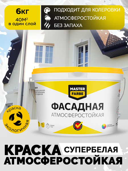 Краска фасадная MASTERFARBE - атмосферостойкая и супербелая краска для минеральных поверхностей. Краска MASTERFARBE предназначена для окраски фасадов, цоколей зданий, бетонных заборов и других элементов, подверженных атмосферным воздействиям в районах со сложными климатическими условиями. Она наносится на бетон, оштукатуренные поверхности, кирпич и другие минеральные материалы. Краска MASTERFARBE обладает супербелым цветом и матовым покрытием. Она колеруется красителями для водно-дисперсионных красок и в колеровочных системах. Краска экологична, без запаха и разбавляется водой. Краска MASTERFARBE легко наносится валиком или кистью, укрывает за 2 слоя и пожаробезопасна (класс пожарной опасности КМ1). Она обладает влагостойкостью и может эксплуатироваться при температуре от 5 до 40 градусов Цельсия. Краска MASTERFARBE имеет объем 14 кг и поставляется в белом цвете. Дополнительная информация: min температура эксплуатации 5°С, max температура эксплуатации 40°С, время высыхания 1 час. Фасадная, амтмосферостойкая, водоэмульсионная, водно-дисперсионная, супербелая, краска для фасадов, для минеральных поверхностей, матовое покрытие.