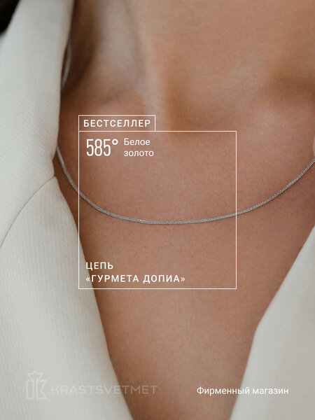 Krastsvetmet / Цепь Гурмета допиа из белого золота 585 пробы с алмазными гранями Плоская золотая лента Гурмета допиа шириной всего 1 мм – цепь тонкая, но прочная. Ее двойные, плотно подогнанные звенья не перекручиваются при движении и прекрасно держат форму. Алмазные грани придают цепи дополнительный блеск и создают правильный геометрический рисунок плетения. Это комфортное практичное украшение, не требующее особых усилий в уходе. Цепь полновесная, качество сплава подтверждено государственным пробирным клеймом 585. Ювелирные украшения бренда Krastsvetmet это отличный подарок по любому поводу и на долгую память - на день рождения, свадьбу, выпускной, 8 марта, Новый год, День Влюбленных, 14 февраля, День Святого Валентина, День Матери, именины, крестины, окончание школы, окончание ВУЗа и получение диплома, на память, юбилей, годовщину, любой праздник - маме, дочери, сестре, жене, подруге, близкому человеку, племяннице, тете, бабушке, девушке, женщине, родному и любимому человеку, другу, мужу, брату, сыну, внуку, учителю, преподавателю, руководителю, коллеге. Украшение находят по запросам: Ювелирные цепи из белого золота для мужчин, Ювелирные цепи из золота 585 пробы, Ювелирные цепи для девочек, Ювелирные цепи для мальчиков, Ювелирные цепи унисекс, Ювелирные цепи с плетением панцирь, Ювелирные цепи из золота мужские, Ювелирные цепи из золота детские, Цепи золотые женские, Цепи женские золотые 585, Цепи из белого золота женские, Ювелирные цепи из золота, Ювелирные цепи из золота, Ювелирные цепи из золота, Ювелирные цепи из белого золота, цепочка золотая, золотая цепочка, скидка на цепочку