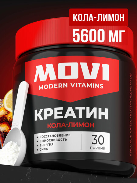 Creatine со вкусом колы и лимона от MOVI — это спортивная добавка с комплексным действием 4 в 1. Спортпит увеличивает силовые показатели, активизирует энергию, повышает выносливость и помогает при восстановлении после физических нагрузок. Креатин моногидрат увеличивает кратковременную анаэробную выносливость, способствует выбросу энергии во время занятий. Спортсмены, принимающие креатин, тренируются дольше по времени и могут делать гораздо больше подходов. Употребление спортивного питания улучшает силовые показатели. Благодаря креатину атлеты получают быстрый набор мышечной массы и добиваются рельефности тела. Микронизированный креатин наиболее биодоступная форма, которая усваивается в полном объеме. Добавка содержит мальтодекстрин - концентрированный углевод, который способствует лучшему усвоению креатина. Витамин С в составе продукта компенсирует дефицит аскорбиновой кислоты, который наблюдается у спортсменов во время интенсивных тренировок, а также помогает в процессе восстановления мышц. Упаковка рассчитана на 30 порций. Содержание креатина в одной порции - 5,6 г. Спортивная добавка подходит мужчинам и женщинам. Рекомендации по приему. Одну мерную ложку порошка смешать с 100-150 мл воды или сока. Принимать утром во время еды, в дни тренировок - за 30 минут до начала физической нагрузки. Курс - 1 месяц, повторить при необходимости. Продукт соответствует международным стандартам по сертификации FSSC, GMP, ISO и HACCP. В составе ингредиенты только высокого качества, которые подойдут вегетарианцам.