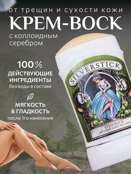 Крем-воск от трещин c коллоидным серебром – косметика для ухода за сухой кожей пяток, стоп, рук, локтей, тела. Уникальный компонент в составе - коллоидное серебро - способствует заживлению ссадин, трещин, укусов насекомых. Масло кокосовое и виноградной косточки и воск - наиболее эффективные природные увлажняющих средства. Питают и разглаживают сухую кожу, устраняет раздражение и шелушение, свойственные чувствительной коже, замедляет процессы старения. Стик идеально подойдёт от натоптышей и мозолей, будет прекрасным уходом как крем для кутикулы Воск для пяток и рук от трещин и сухости превосходно помогает от сухости и подходит любой коже. Небольшой, но экономичный по расходу крем для стоп ног является идеальной уходовой женской косметикой. Он питательный борется с трещинами на пятках, с шелушениями на коже, с обветриваниями и работает против мозолей и натоптышей. Его также можно использовать в качестве крема для кутикулы и для педикюра. Крем-воск от трещин для сухой кожи подходит для пяток, стоп ног и педикюра. Косметика SILVERSTICK включает в себя натуральные ингредиенты. Чаще всего в бассейне можно подцепить грибковые инфекции, папилломовирус и чесотку. Увеличивается и вероятность воспаления и заражения сразу после бассейна - в раздевалке. Что делать? Использовать наш крем-воск Коллоидное серебро - обладает выраженными бактерицидными свойствами, оказывает противовоспалительный эффект, антимикробным действием. Защитит от грибка на ногах и ногтях, поможет избавится от уже имеющихся проблем с кожей. Крем для стоп смягчающий обеспечивает питание и увлажнение кожи. Станет отличным подарком на 14 февраля, День всех влюбленных, День Святого Валентина, 8 Марта, день рождения, юбилей, годовщину, день матери, Новый год, Рождество любимой девушке, женщине, подруге, жене, бабушке, маме, сестре, коллеге, дочери, тёте, свекрови, тёще