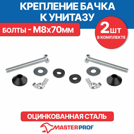 Изделие состоит из крепления и гайки барашек. С помощью данного приспособления можно фиксировать бачок унитаза. В наборе 2 крепления. Состав комплекта: Винт DIN 7985 8*70 - 2 шт; Гайка барашек DIN 315 M8 - 2 шт; Шайба плоск. увелич. DIN9021 М 8 - 2 шт; Прокладка резиновая 1/2" - 2 шт; Шайба резиновая конусная М8 - 2 шт.