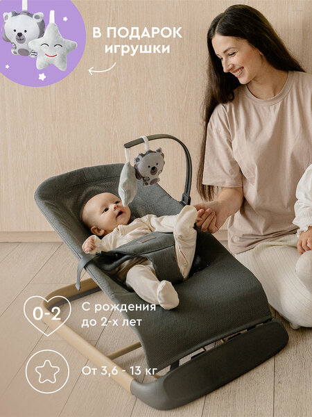 Достоинства:Стильный, лёгкий, качественный шезлонг Недостатки:Неудобно расположена кнопка изменения наклона. Цвет игрушек - серый, можно было сделать черно-белыми хотя бы, чтобы детям было интересно на них смотреть. Нет крепления для других игрушек. Комментарий:В целом шезлонг понравился, сравнить не с чем, но иногда очень выручает, чтобы отвлечь ребенка)