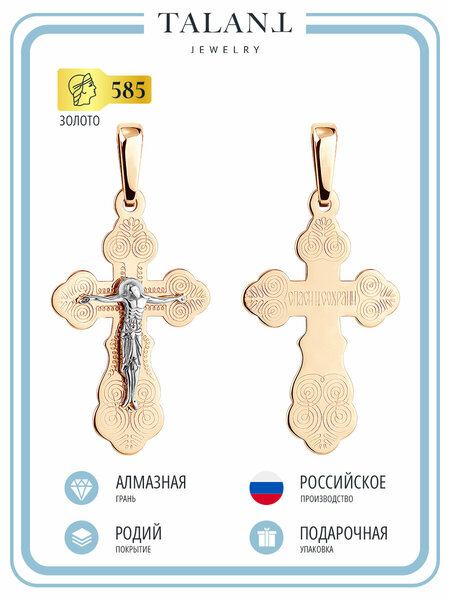 Крестик TALANT из комбинированного золота 585 пробы с родированием - это изысканное ювелирное украшение, которое станет отличным дополнением к вашему образу. Изготовленный с вниманием к деталям, этот крестик сочетает в себе элегантный дизайн и символическое значение, что делает его идеальным подарком для близких или для личного использования. Изготавливаемый с использованием высококачественных материалов, крестик приковывает внимание своим блеском и изяществом. Крестик TALANT станет не только шикарным аксессуаром, но и важным символом веры, который вы сможете носить с собой каждый день. Родирование защищает от потемнения и увеличивает срок использования. Технология алмазной грани придает изделию блеск, украшение сверкает и переливается. Подлинность изделия подтверждается: пробирным клеймом (пробой), именником производителя, биркой и пломбой завода. Обратите внимание, фактический вес изделия может отличаться от среднего, указанного в характеристиках. О заводе: Санкт-Петербургский Ювелирный Завод TALANT - это крупный производитель по-настоящему качественной ювелирной продукции.