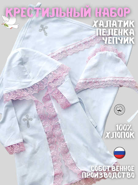 Название товара: Крестильные наборы для крещения "Дети в цвете" Бренд: "Дети в цвете". Крестильный комплект включает в себя: - Крестильный халат с капюшоном и завязками, выполненный из 100%-ного хлопка. - Чепчик из кулирки, выполненного из тонкого трикотажного полотна. - Пеленка-уголок, выполненная из интерлока, более плотного материала. Каждое изделие украшено красивым кружевом разных цветов: белого, голубого, розового и бежевого. Размеры: от 0 до 1 года (на малышей), комплект подходит на возраст до 86 роста. Крестильная одежда с крестиками и красивым кружевом - это уникальный и душевный подарок на крещение для малыша. Этот набор подойдет для мальчика или для девочки. Мы уверены, что все будут в восторге от этого набора! А цена вас приятно удивит!