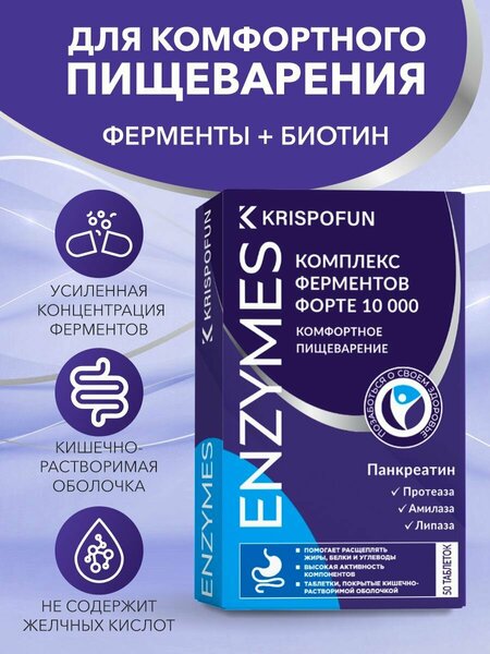Дискомфорт, тяжесть в желудке, тошнота, метеоризм, нарушения стула — самые частые симптомы несварения (диспепсии), которое обусловлено нехваткой пищеварительных ферментов. Для коррекции кратковременных нарушений пищеварения оптимальными являются препараты, содержащие до 10000 ЕД липазы в таблетке. Препараты с более высоким содержанием липазы рекомендованы к приему только по назначению врача1. Комплекс ферментов Форте 10000 в кишечнорастворимой оболочке способствует устранению дефицита ключевых энзимов (амилазы, липазы, протеазы), необходимых для полноценного расщепления белков, жиров и углеводов, поступающих с пищей. Кишечнорастворимая оболочка обеспечивает2: • Надежную защиту активных ферментов от инактивации желудочным соком; • Физиологическую этапность пищеварительного процесса: высвобождение и активацию ферментов только при щелочном рН, непосредственно в двенадцатиперстной кишке. Ферменты: • Усиленная концентрация ферментов: 10000 ЕД в каждой таблетке; • Оптимальное соотношение энзимов обеспечивает лучший процесс переваривания; • Не влияют на моторику желудочно-кишечного тракта, секрецию желчи, функцию желчевыводящих путей, так как не содержат в составе желчных кислот. Ферменты из панкреатина, в отличие от растительных энзимов, предпочтительнее для коррекции ферментативной недостаточности. Биотин: • Важный природный регулятор метаболизма белков, жиров и углеводов. Помогает поддерживать нормальный уровень глюкозы в крови и активность полезной кишечной микробиоты. Противопоказания: Индивидуальная непереносимость компонентов БАД, беременность, кормление грудью. Перед применением рекомендуется проконсультироваться с врачом. Не является лекарственным средством.