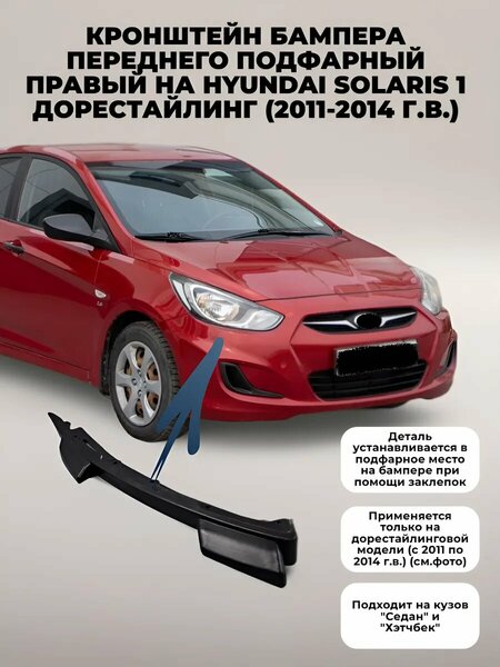 Кронштейн (планка) переднего бампера к фаре правый для Hyundai Solaris 2011, 2012, 2013, 2014 г. в. (дорестайлинг). Деталь хорошего качества , устанавливается в штатные места без доработок. Деталь приклепывается (на заклепках) к бамперу, защелкивается в кронштейн на фаре. Для проверки применяемости сверьте визуальное сходство с фотографиями автомобиля (см фото) Если Вы не уверены в применяемости детали к Вашему авто, отправьте в форму "задать вопрос" Vin-код Вашего автомобиля, мы Вам обязательно поможем. Номера ОЕМ: 865841R000, 86584-1R000.