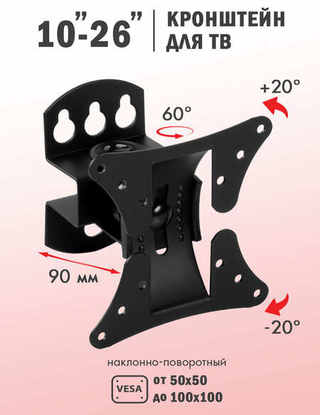 ARM MEDIA LCD-101 надёжно удержит экран размером 10"-26" дюйма и весом 30 кг. Простая конструкция ARM MEDIA LCD-101 идеально подойдет для самостоятельного монтажа. Наклонно-поворотная регулировка позволит наклонять вверх и вниз на ±20°, поворачивать влево и вправо на 60°, и выдвигать на 90 мм. Кронштейн подходит для большинства телевизоров диагональю 10, 15, 20, 21, 22, 23, 24, 27, 31, 32 дюймов популярных брендов. Крепёжные отверстия ARM MEDIA LCD-101 изготовлены по стандарту VESA. В комплектацию ARM MEDIA LCD-101 входят необходимые для монтажа материалы. Вся продукция обеспечивается гарантийными обязательствами. 18 лет гарантии на все сварные и механические соединения позволит наслаждаться конструкцией долгий срок. Во время эксплуатации ARM MEDIA LCD-101 демонстрирует поразительную износостойкость и безотказность.