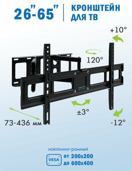 TUAREX OLIMP-606 надёжно удержит экран размером 26"-65" дюйма и весом 45 кг. Простая конструкция TUAREX OLIMP-606 идеально подойдет для самостоятельного монтажа. Наклонно-поворотная регулировка позволит наклонять вверх и вниз на +10 -12°, поворачивать влево и вправо на 120°, и выдвигать на 73-436 мм. Кронштейн подходит для большинства телевизоров диагональю 32, 37, 38, 39, 40, 42, 43, 47, 48, 49, 50, 55, 58, 60, 65 дюймов популярных брендов. Крепёжные отверстия TUAREX OLIMP-606 изготовлены по стандарту VESA. В комплектацию TUAREX OLIMP-606 входят необходимые для монтажа материалы. Вся продукция обеспечивается гарантийными обязательствами. 25 лет гарантии на все сварные и механические соединения позволит наслаждаться конструкцией долгий срок. Во время эксплуатации TUAREX OLIMP-606 демонстрирует поразительную износостойкость и безотказность.