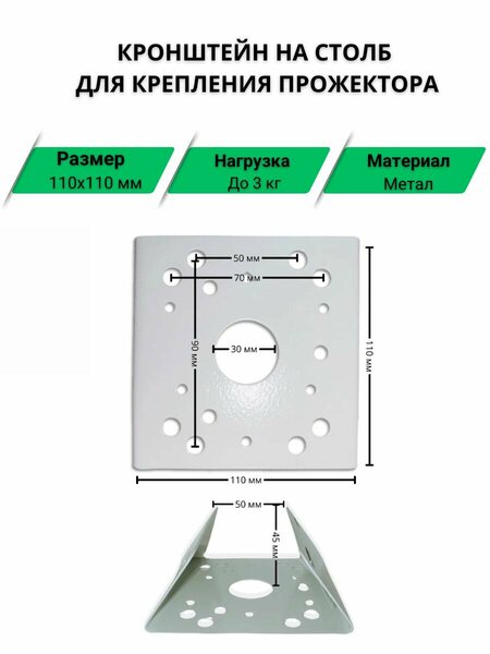 Кронштейн крепление на столб камеры или прожектора: функциональность и особенности: Размер кронштейна 110х110 мм В современном мире, где безопасность и контроль играют ключевую роль, все больше внимания уделяется оснащению объектов системами видеонаблюдения и освещения. Кронштейн на столб — это надежное и удобное устройство, позволяющее разместить камеру наблюдения или прожектор на столбе, заборе или любой другой вертикальной поверхности. Кронштейн крепление камеры на столб представляет собой конструкцию, состоящую из основания которое крепится к поверхности столба при помощи крепежной ленты или хомутов (в комплект не входят) Ключевыми преимуществами использования кронштейна на столб являются: Универсальность: кронштейн подходит для установки камер различных типов и размеров, а также прожекторов с различными типами ламп. Надежность и прочность: конструкция кронштейна обеспечивает надежное крепление устройства на столбе и предотвращает его падение или смещение. Удобство использования: позволяет легко регулировать направление камеры или прожектора, что обеспечивает оптимальный обзор и освещение территории. Эстетичный вид: кронштейн на столб не только выполняет свою основную функцию, но и является элементом декора, придавая объекту законченный и аккуратный вид. Площадка на столб 110х110 мм с дополнительными отверстиями. Устанавливается на столбы. Крепится хомутами или крепежной лентой. Покрытие: порошковая окраска. Внимание! хомуты и крепежная лента в комплект не входят