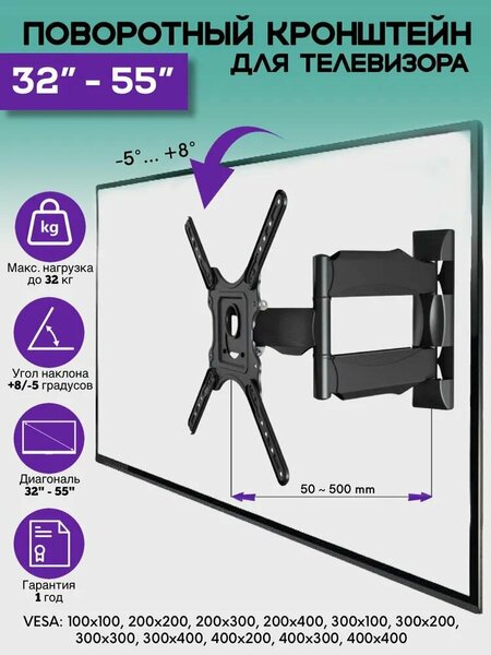 Описание Наклонно-поворотный настенный кронштейн NB P4 предназначен для телевизоров с диагональю от 32 дюймов, максимальная нагрузка 31,8 кг, четыре степени свободы, угол наклона -5-+8°, поворот 180°, регулируемое расстояние от стены от 53 мм до 498 мм, съемная монтажная пластина, максимальный стандарт VESA 400x400, цвет черный.