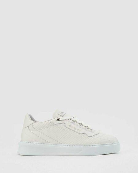 Белые кроссовки из натуральной кожи Roberto Cavalli. Кроссовки в смелом стиле, фирменный дизайн которых подчеркивает повторяющийся мотив Cavalli Mirror Snake из металла сбоку. Пара выполнена из натуральной белой кожи с эффектной текстурой змеиной чешуи. Текстильная шнуровка и прочная резиновая подошва белого цвета сохраняют эстетику спортивной обуви. Подкладка и стелька выполнены из натуральной кожи.