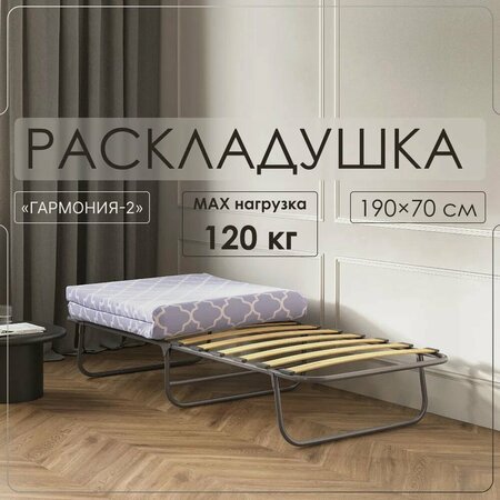 Раскладная кровать «гармония 2» подойдет как для домашнего использования, так и для отдыха на природе. Она выполнена в лучших традициях складной мебели, однако имеет ряд преимуществ. Прежде всего, она невероятно прочная. Конструкция выполнена таким образом, что раскладушку практически невозможно сломать! Раскладушка проста в использовании, компактна в хранении. Основание раскладушки, выполненное из березовых ламелей, обеспечивает самостоятельный ортопедический эффект и идеально подходит для использования с ортопедическим матрасом. В комплектацию данной кровати входит мягкий матрас для более комфортного отдыха. Раскладушка отличного качества при очень бюджетной цене. По отзывам покупателей, уровень удобства и качество сна такие же, как на обычной кровати с ортопедическим основанием. Эта раскладушка не боится постоянного использования и больших нагрузок и прекрасно подойдет даже для ежедневного сна.