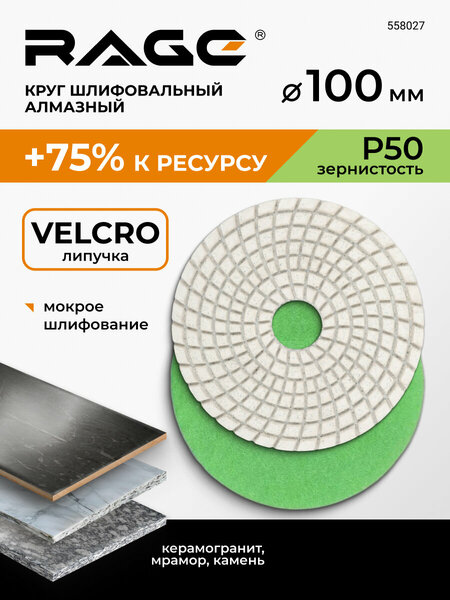 Круг шлифовальный алмазный RAGE by VIRA 100 мм P50. Абразивный круг из полимерной связки с алмазной крошкой предназначен для обработки всех разновидностей искусственного и натурального камня, включая высокопрочные породы, такие как мрамор и гранит. Данный тип хорошо подходит для выполнения точных работ. Круг легко устанавливается на опорную чашку и заменяется, по необходимости, на подобный или на круг с другой зернистостью благодаря креплению липучке. Используется с эксцентриковыми шлифмашинками, УШМ, дрелями. Высокий ресурс и надежность этого инструмента, дают возможность получить гладкие поверхности на большом объеме обрабатываемых материалов. Предназначен для мокрого шлифования (с водяным охлаждением).