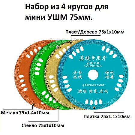 Круги набор 4 в 1 для мини УШМ 75мм, отрезной, пильный, зачистной, расходники, по дереву, металлу