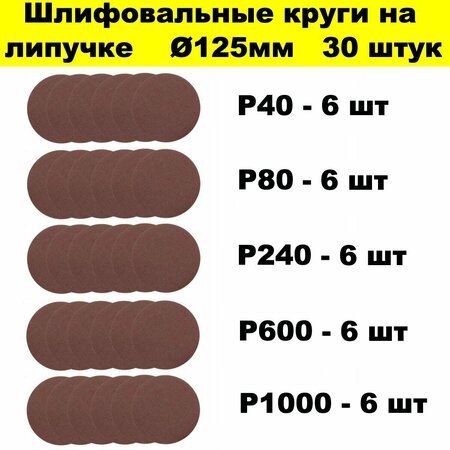 Круги шлифовальные 125 мм 30 штук набор из 5 зернистостей: Р40, Р80, Р240, Р600 и Р1000