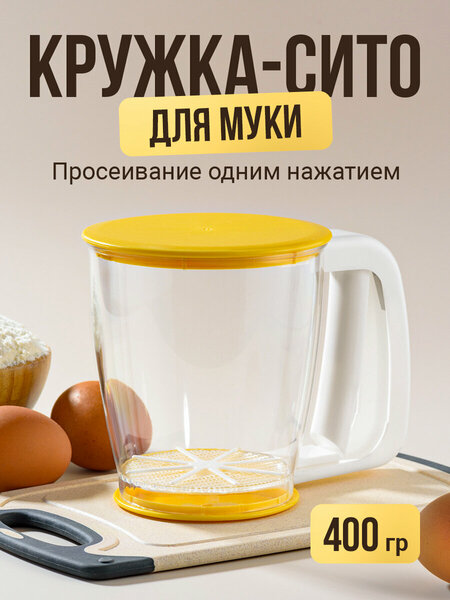 Кружка сито для муки — это отличный помощник на кухне, где любят чистоту и порядок, но при этом любят готовить. Сито с ручкой позволяет просеивать муку таким образом, чтобы ваш пол и столешница остались абсолютно чистыми. Старые просеиватели муки, которые нужно было трясти из стороны в сторону, уходят в прошлое. Сейчас, чтобы хорошо просеить муку без комочков, нужна всего лишь кружка-сито для муки. Механическое сито имеет пружинный механизм, который вращает лопасти на дне кружки, и разбивает все комочки. Управлять скоростью и интенсивностью помола муки можно просто нажимая на ручку сита. Такой просеиватель не нужно трясти в руках, поэтому мука не будет рассыпаться по всей кухне. Кружка для просеивания муки выполнена из прочного пищевого пластика и имеет две крышки сверху и снизу. Если вы вдруг положили в сито для муки с ручкой слишком много продукта, закройте крышки с двух сторон и поставьте на полку — пригодится в следующий раз. Крышки ситечка для муки закрываются плотно, поэтому внутри сита кухонного не заведутся никакие жучки. Стакан сито для муки можно использовать и как сито для сахарной пудры, какао и других смесей, которые нужно перемолоть в мелкий порошок. Их точно также можно хранить внутри и использовать сито для муки как кружку для хранения сыпучих смесей. Кружку сито для просеивания муки удобно держать в руках — она легкая и не требует никаких сверх усилий в использовании. Поэтому смело приглашайте маленьких помощников для приготовления выпечки — дети с удовольствием будут принимать участие в процессе. Размеры сита пластмассового: длина с ручкой — 15 см, диаметр — 12 см, высота — 13 см. Добавляйте современный и удобный аксессуар в свои кухонные принадлежности и готовьте с удовольствием всей семьей!
