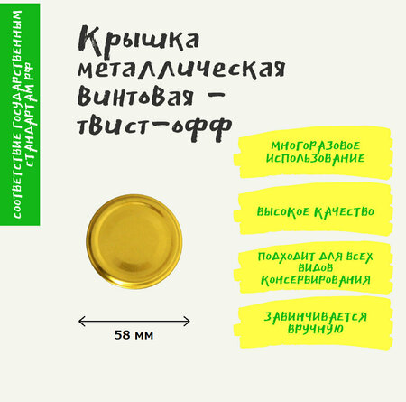 Крышка металлическая винтовая - твист-офф. Предназначена для стерилизованной и пастеризованной пищевой продукции при консервировании в домашних условиях. Характеристики: тип: крышка твист-офф (винтовая); диаметр: 58 мм; назначение: закрывание и консервирование; материал: белая жесть ЭЖК; наружное покрытие: золотистый лак; внутреннее покрытие: белая эмаль и адгезионный лак, предназначенный для контакта с пищевыми продуктами; толщина металла: 1,9 мм; цвет: золото; рисунок: нет; индивидуальная упаковка: нет; групповая упаковка: навалом в гофротаре. Преимущества: Соответствие ТУ 9299-001-039653-2002. Многоразовое использование. Идеально подходит для всех видов консервирования в промышленных и домашних условиях, укупоривания плодоовощных, мясных и рыбных консервов.