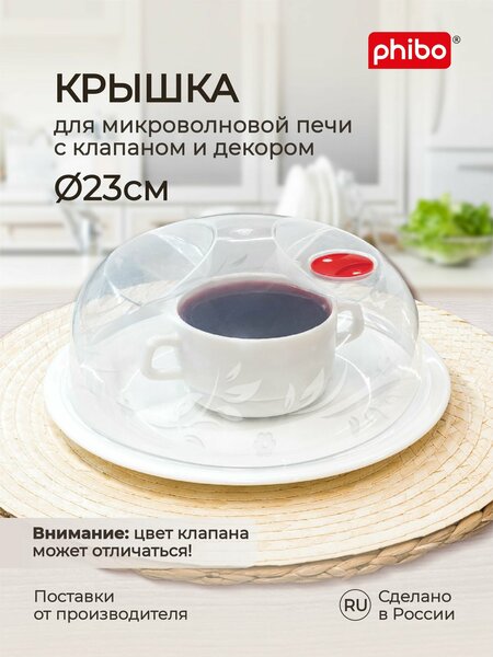 Защитная крышка для микроволновой печи с рисунком, диаметром 23 см - удобное и стильное решение для кухни. Этот практичный аксессуар предназначен для защиты от разбрызгивания загрязнений: брызг жира, жирной грязи при приготовлении и разогревании блюд в плитке! Брызгогаситель обеспечит чистоту внутренней поверхности бытового прибора. Внимание: при использовании не включать режим гриля! Клапан должен быть открытым! Для выпуска пара есть два положения: открыт/закрыт. Не допускает перегрева, накопления испарений. Есть оригинальная ручка. Крышечку можно применять как приспособление для организации хранения еды в холодильнике: накрывать торт, сыр, блины, закуски, нарезки. Она защитит от запахов, влаги, сбережет свежесть, предотвратит заветривание пищи; сохранит выпечку свежей, увеличит срок годности. Еще многофункциональная крышка станет помощником на даче, спасет продукты от мух, насекомых при сервировке стола на улице. Прозрачный пластмассовый корпус позволяет наблюдать за готовкой, разогревом без необходимости поднимать колпак. Конструкция предмета подходит под большинство тарелок, поддонов, противней. Круглая форма компактного размера не занимает много места. Легко мыть в посудомоечной машине (ПММ, посудомойке). Современный стиль и дизайн, декоративный орнамент посуды будет украшением интерьера дома. Анти разбрызгиватель помимо функциональности обладает красивым внешним видом. Светлый цвет делает утварь эстетичным элементом коллекции кухонных принадлежностей. Универсальный хозяйственный инвентарь, можно подарить как полезный подарок женщине, хозяйке, любителям кулинарии. Повод: Новый год, день рождения, новоселье, 8 марта, просто так. Брызгозащитное изделие от российского производителя отличается высоким качеством, изготовлено из прочного полимерного материала, безопасной пищевой пластмассы. Следите за новинками, скидками, акциями, большими распродажами, самым широким ассортиментом продукции из полимеров в каталоге хозтоваров нашего магазина и оригиналов брендов фирмы. Цвет клапана может отличаться!