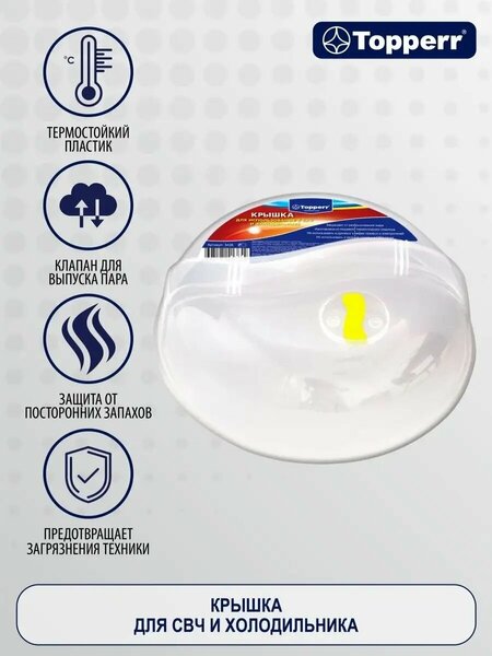 Крышка с Удобной Ручкой для использования в СВЧ и холодильнике, диаметр 26 см, высота 11 см. Изготовлена из пищевого термостойкого пластика. Topperr 3427 Если вы ищете удобный и безопасный способ приготовления пищи в микроволновой печи, то крышка для микроволновки - это именно то, что вам нужно. Крышка защитит вашу печь от брызг и позволит сохранить влагу в продуктах, что сделает их более сочными и вкусными. У нас есть ассортимент крышек для микроволновых печей. Крышки изготовлены из прозрачного пластика, который позволяет наблюдать за процессом приготовления без необходимости снимать крышку. Крышки также могут иметь отверстия для выхода пара, что помогает избежать переполнения печи и сохранить безопасность при использовании. Крышки для свч-печей - это не только защита от брызг, но и экран от излучения, что делает использование печи еще более безопасным. Крышки изготовлены из прочного пластика, который легко моется и не деформируется при повторном использовании. Выбирайте крышку для микроволновки или свч-печи, которая подходит для вашего инвентаря и наслаждайтесь быстрым и безопасным приготовлением пищи