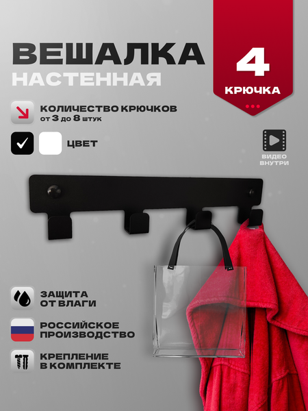 Вешалка настенная- универсальный помощник для организации порядка дома. Ее крючки идеально подходят для ванной комнаты. Изготовлена из качественного металла, эта модель выдерживает повышенную влажность благодаря влагостойкому порошковому покрытию. Настенная вешалка станет удобным решением для размещения полотенец и других аксессуаров. Легко крепится на стену методом сверления, фиксируется саморезами для надежного держания. Подходит как для современного интерьера, так и классического или стиля лофт. Изготавливается в двух цветах – матовый черный и белый, что позволяет придерживаться выбранной цветовой гаммы в помещении. Ваша ванная будет выглядеть аккуратно и стильно благодаря этой практичной детали. Универсальность конструкции с 4 крюками открывает множество вариантов использования: можно повесить халат, полотенце или другие мелочи, которые всегда должны быть под рукой. Металл обеспечивает долговечность изделия, а лаконичный дизайн впишется в любой интерьер. Простота установки делает использование максимально удобным даже без помощи специалистов. Благодаря прочному покрытию крючки прослужат долгое время, радуя глаз и обеспечивая нужную функциональность. Такой элемент декора будет полезен не только в ванной комнате; его можно использовать также на кухне или в прихожей для ключей и других предметов. Организуйте пространство легко — ваша новая настенная вешалка сделает это без лишних усилий! Практичность здесь сочетается с элегантностью дизайна и простотой использования, что является большим плюсом для любого дома. Вы оцените все преимущества уже при первом использовании — все вещи будут аккуратно висеть на своих местах. С этой моделью порядок становится естественной частью вашего быта! Стена обретет новую функциональную зону без ущерба стилю помещения. Надежная фиксация позволит не беспокоиться о возможных поломках или ослаблении конструкции со временем.