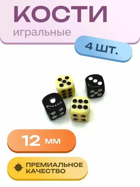Игральные кубики в черном цвете и слоновая кость 12 мм, игральные кости используются в различных настольных играх, включая нарды и покер. Зарики являются незаменимым аксессуаром для веселого и интересного времяпровождения. Изготовлены из качественного пластика, поэтому имеют долгий срок службы. При падении на ровную поверхность, игральные кости занимают одно из шести возможных положений, благодаря чему являются популярным источником случайности в настольных играх. Их углы слегка закруглены для улучшения скольжения по поверхности игрового стола и равномерного распределения вероятностей выпадения чисел. Игральные кости комплектуются в наборы для разных настольных игр и могут использоваться в качестве игральных костей для нард. Стандартный кубик 4 шт (кость, зарик) для игры в настольные игры, на шести гранях которого нанесены комбинации точек с числами (1, 2, 3, 4, 5, 6); сумма точек на противоположных гранях всегда составляет семь. Количсество в упаковке: 4 шт. Материал: пластмасса. Размер, см: 1,2 х 1,2 х 1,2 см. Кубики игральные пластмасовые – это неотъемлемый элемент многих игр, начиная от классических костей и настольных игр, таких как нард, и заканчивая современными игровыми наборами. Они бывают разных размеров, форм и материалов, но чаще всего используются пластиковые или пластмассовые кубики. Выбор игральных кубиков зависит от предпочтений игроков и типа игры. Для некоторых игр нужны обычные шестигранные кости, а для других – специальные дайсы с большим количеством граней. Также важны аксессуары, такие как кубикодержатели, которые облегчают игру. Кубики игральные могут быть не только полезными, но и интересными игрушками для детей. Они развивают логическое мышление и моторику рук. Для маленьких детей лучше использовать большие и яркие пластмассовые кубики. В целом, кубики игральные – это универсальный элемент для различных видов игр. Независимо от того, какой тип игры вы предпочитаете, всегда найдется подходящий набор кубиков.