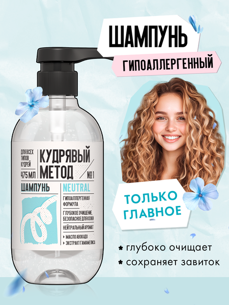 Гипоаллергенный шампунь для кудрявых и вьющихся волос из линейки NEUTRAL обогащен маслом авокадо и пантенолом, которые оказывают увлажняющее действие и имеют укрепляющий и восстанавливающий эффект. Здесь нет резких ароматов и перегруженных композиций – только мягкая гипоаллергенная формула, которая бережно ухаживает за волосами, а нейтральный аромат обеспечивает комфорт при использовании. Идеальный выборо для чувствительной кожи головы. Глубоко очищающий шампунь создан для ежедневного применения для всех типов вьющихся локонов. Идеальное средство для укрощения непослушных, пористых и пушистых локонов. Благодаря натуральным маслам и увлажняющим компонентам он бережно очищает пряди без пересушивания. Подходит для жирной и нормальной кожи головы. Можно использовать для натуральных, после биозавивки и окрашенных волос, а также для восстановления сухих, поврежденных, лишенных блеска локонов. Создан для кудрявого метода. Он призван подчеркнуть естественную текстуру кудрей, предотвратить их сухость и пушение, придать объема, эластичности и блеска. Способ применения: нанесите средство на влажную кожу головы, вспеньте массирующими движениями, затем тщательно смойте водой. Для максимального эффекта попробуйте бальзам и продукты стайлинга для ухода за вьющимися волосами от бренда «Кудрявый метод!»