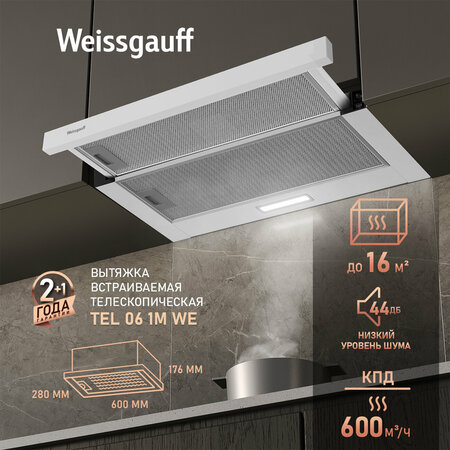 Встраиваемая в верхний подвесной шкаф телескопическая вытяжка от Weissgauff, обладающая впечатляющей производительностью 600 м3/ч и низким уровнем шума , выполненная в белом цвете, не только порадует своей функциональностью, но и станет настоящим украшением вашей кухни! Производительность 600 м3/ч это внушительный показатель, который позволит эффективно и бескомпромиссно справиться с задачей по очистке воздуха на вашей кухне! Эффективная работа в помещении площадью до 16 м2 - это гарантия того, что после установки вытяжки Weissgauff, обновление воздуха будет соответствовать всем требуемым нормам, сохраняя ваше здоровье на долгие годы! Низкий уровень шума 44 дБ сделает работу с данной вытяжкой по-настоящему комфортной и приятной, ведь мы в Weissgauff знаем, как добиться высокой производительности без лишнего шума! Дизайн выполненный в белом цвете станет финальным штрихом в совершенстве великолепного облика этой модели. Каждый раз, заходя на кухню, вы будете чувствовать, что эта вытяжка - не просто функциональное устройство, но и настоящее украшение вашей кухни! Слайдерная технология делает эту великолепную модель компактной и незаметной, когда она выключена, и при этом способной за считанные секунды перейти в активное состояние, когда она становится нужна. Интуитивно понятный и удобный блок управления позволит вам с легкостью включить или выключить вытяжку, выбрать необходимую скорость и управлять встроенным освещением Работа в режимах отвода и циркуляции откроет вам широкие возможности по установке этой вытяжки в проект вашей кухни. Организуйте полноценный вывод воздуха из помещения или установите угольный фильтр и используйте вытяжку вместе с ним - какой бы вариант вы ни выбрали, модель от Weissgauff сделает это возможным! Алюминиевый жировой фильтр особой трёхслойной конструкции, с асинхронным расположением решёток, эффективно защитит двигатель от жира и испарений, продлив срок службы устройства. Интегрированное LED-освещение дает возможность создать более комфортные условия на кухне и использовать эту вытяжку как дополнительный источник кристально чистого и яркого света. Возможность установки угольного фильтра станет отличным решением для вытяжки, работающей в режиме рециркуляции, позволяющим повысить эффективность очистки воздуха и избавиться от нежелательных запахов!