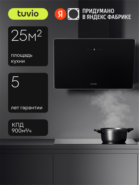 Tuvio — это бренд удобной бытовой техники, придуманный в Яндекс Фабрике. Tuvio RHW66TBG11 — это наклонная вытяжка для кухни площадью до 25 м². Мощность мотора — 210 Вт, производительность — до 900 м³/ч: вытяжка быстро очищает воздух даже во время интенсивной готовки. Запахи и пар захватываются по периметру вытяжки и не распространяются по кухне. На сенсорной панели управления легко выбрать одну из трёх скоростей для разных задач — от повседневного приготовления до жарки на сильном огне. С яркой LED-подсветкой рабочая зона хорошо освещается, чтобы готовить было удобно в любое время суток. После завершения готовки можно включить функцию задержки выключения: вытяжка будет работать ещё 3 минуты, чтобы полностью удалить остаточные запахи. Вытяжку можно подключить к вентиляции или использовать автономно в режиме рециркуляции. Для этого в комплект входят два фильтра: алюминиевый жировой и угольный — чтобы устройство сразу было готово к работе по любому сценарию. Фильтры легко устанавливать и снимать: алюминиевый можно мыть вручную или в посудомоечной машине, а угольный — заменить по мере необходимости. Корпус чёрного цвета — прочный и простой в уходе: сделан из окрашенного металла с декоративной фронтальной панелью из закалённого стекла. Раздвижной кожух аккуратно скрывает воздуховод и делает вытяжку незаметной в интерьере. Гарантия на вытяжки Tuvio — 5 лет.