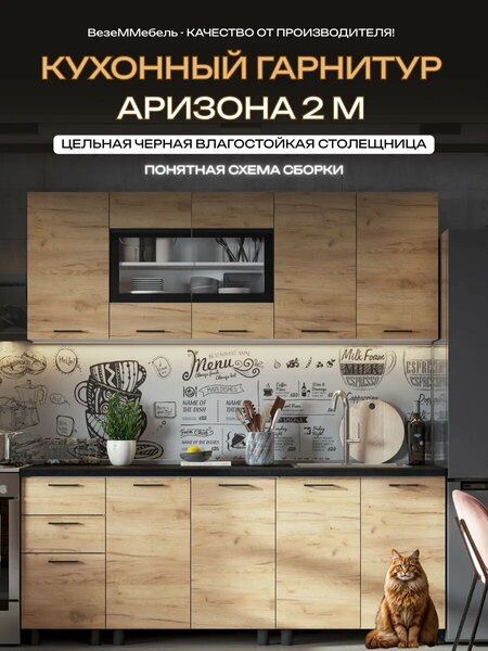 Готовый комплект модульный из коллекции Аризона - это самый модный на сегодня дизайнерский тренд soft loft в интерьере вашей кухни. Броский, незабываемый, неординарный. В этой коллекции скупые черты лофта смягчаются сложным древесным декором состаренного дуба, и обрушивают на нас максимальный контраст светлого корпуса и черных элементов в виде столешницы, опор, кромок, ручек. Оснащена всеми необходимыми нишами и полками для комфортного размещения посуды и продуктов, а также двухметровой рабочей поверхностью, покрытой цельной влагостойкой черной столешницей 38 мм. Нижний модуль на 800 мм под врезную мойку не имеет задней стенки для удобного монтажа сантехники. Стол на 800 мм оснащен вместительным полочным пространством для крупной кухонной утвари. Модуль, имеющий три выкатных ящика разных по глубине, позволяет хранить все необходимые принадлежности кухни по габаритам. Два верхних модуля на 800 мм и шкаф на 400 мм оснащены полочным пространством. Особенностью верхней группы является интегрированные в створки одного из элементов стекла с черной рамой. Современный декор "Крафт Золотой" в сочетании с черной столешницей подходит для любого современного стиля интерьера. Врезная мойка и цельная столешница - это: - Более эстетичный и современный вид – мойка утоплена в столешницу. - Легче убирать – нет щелей, куда может попадать вода. - Более устойчивая конструкция. Отверстия для сборки и элементы выполнены на заводе на самых современных станках, что обеспечивает качество и легкость сборки. Вы сможете наслаждаться не только эстетикой, но и удобством, которое предлагает наша мебель. Не беспокойтесь о доставке — мы обеспечиваем быстрый и надежный сервис, который привезет заказ прямо к вашей двери, сохраняя каждый элемент в идеальном состоянии. Стиль дизайна: лофт, современный, классический Характеристики мебели: