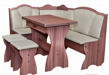 Размер скамьи: длина 1500 мм. ширина 1100 мм. высота 910 мм. Размер стола: длина 850 (1140) мм. ширина 570 мм. высота 750 мм. Размер табурета: длина 330 мм. ширина 330 мм. высота 420 мм. Функциональность: с ящиками, с раскладным столом, угол собирается на обе стороны