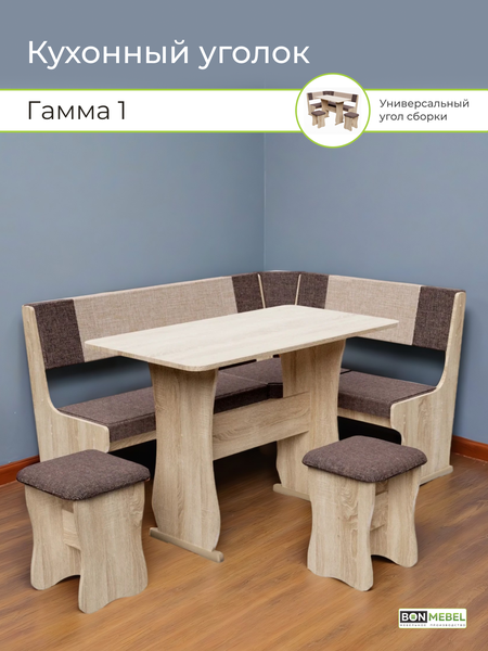 Кухонный уголок «ГаммаТип 1» это идеальное решение для размещения в обеденной зоне. Комплект представлен в наборе: угловая скамья, обеденный стол и два табурета. Кухонный уголок подойдет для оформления небольшой кухни дома или дачи. Имеет универсальный тип сборки. - Размер скамьи в собранном виде (ШхГхВ): 150х110х80см. - Высота сиденья от пола 43см. - Глубина сиденья 34,5см. - Ширина сиденья 87,8см. - Высота спинки 22,5см. - Ширина большой спинки 127см. - Ширина малой спинки 110см. - Размер табуретов (ШхГхВ): 34х34х43см. - Размер стола (ШхГхВ): 110х60х76см. - Максимальная рекомендованная нагрузка на одно посадочное место 75кг. - Прочный каркас выполнен из ламинированной ЛДСП. В качестве обивки используются: внимание ! В качестве обивки сейчас используются Микровелюр, который имеет повышенную прочность и износостойкость. *Цветопередача может отличаться от оригинала. Кухонный уголок доставляется в разобранном виде в 2 гофрокоробах, с фурнитурой, подробной инструкцией по сборке и рекомендациями по уходу. Пожалуйста, сохраняйте все упаковки и этикетки до полной установки кухонного уголка. Мы внимательно проверяем и тщательно упаковываем товар перед отправкой, чтобы покупка приносила Вам радость!